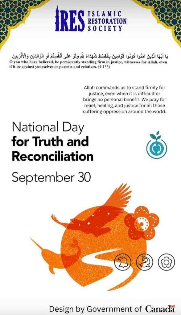 National Day for Truth and Reconciliation – September 30, we pause to remember the children, families, and communities who were deeply affected by the residential school system in Canada. At IRES (Islamic Restoration Society), we see this day not only as remembrance but also as a moment for prayer, healing, and hope. The Qur’an reminds us: